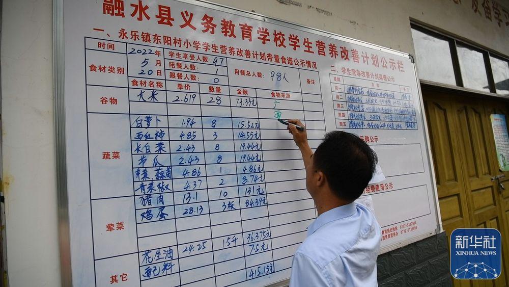 5月20日,在廣西融水苗族自治縣東陽(yáng)村小學(xué)食堂,校長(zhǎng)藍(lán)正立在告示牌上寫(xiě)菜譜。新華社記者 張愛(ài)林 攝