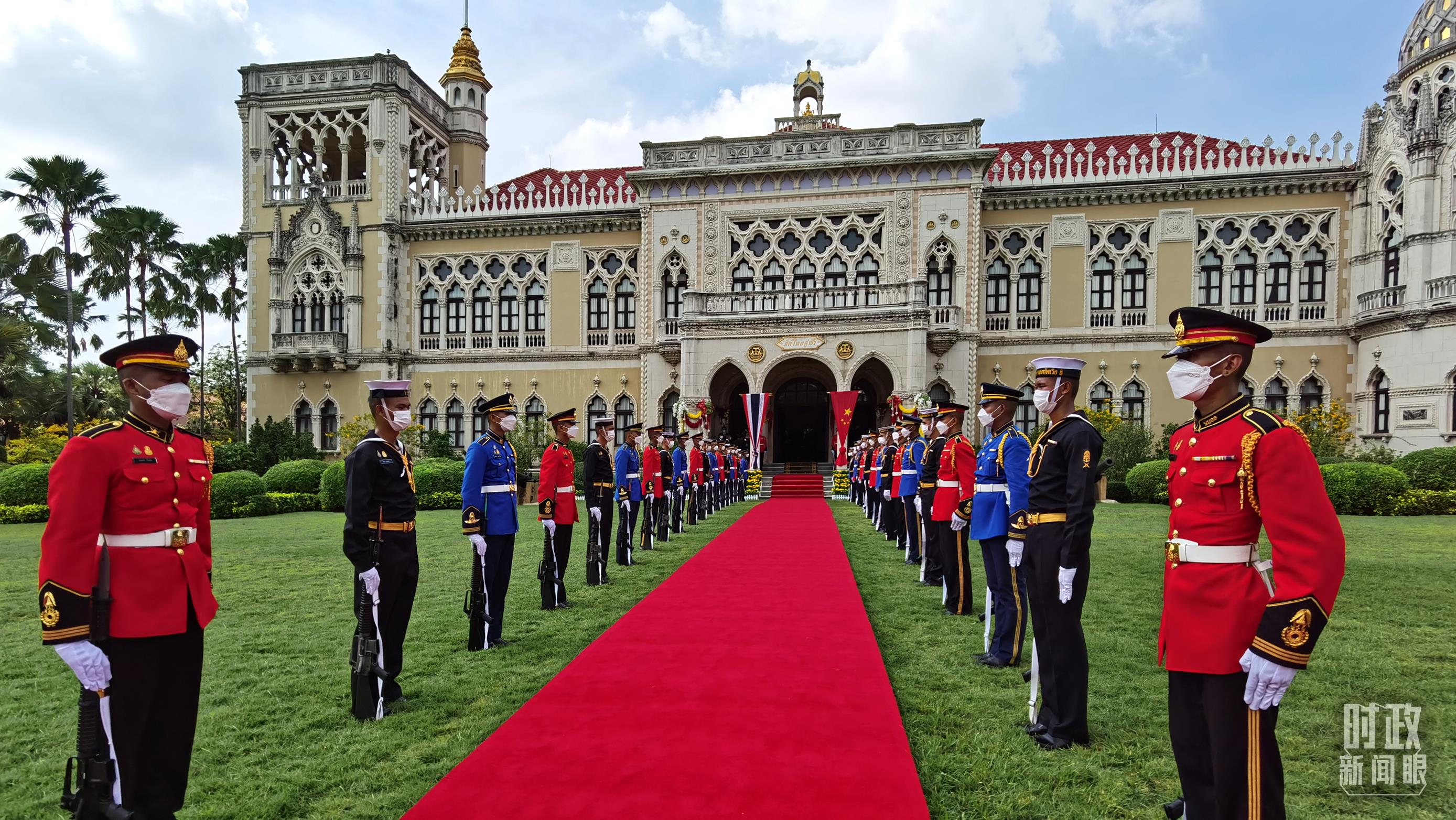 △曼谷總理府前整齊排列的儀仗隊(duì)。(總臺(tái)央視記者郭鴻拍攝)