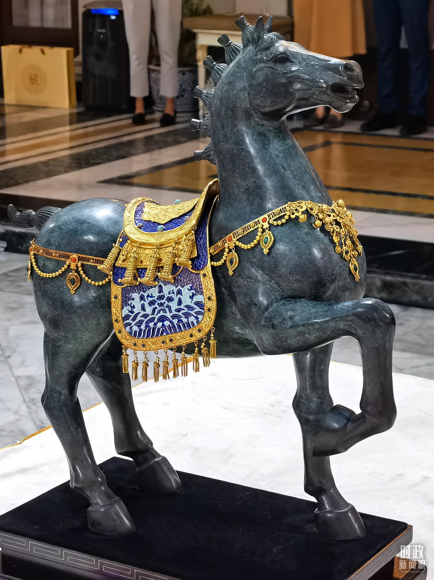 △這是習(xí)近平送給巴育的國(guó)禮之一,將軍馬《金玉滿堂》。馬身裝飾以花絲、松石,寓意登高臨風(fēng)、前路暢通。(總臺(tái)央視記者馬超拍攝)