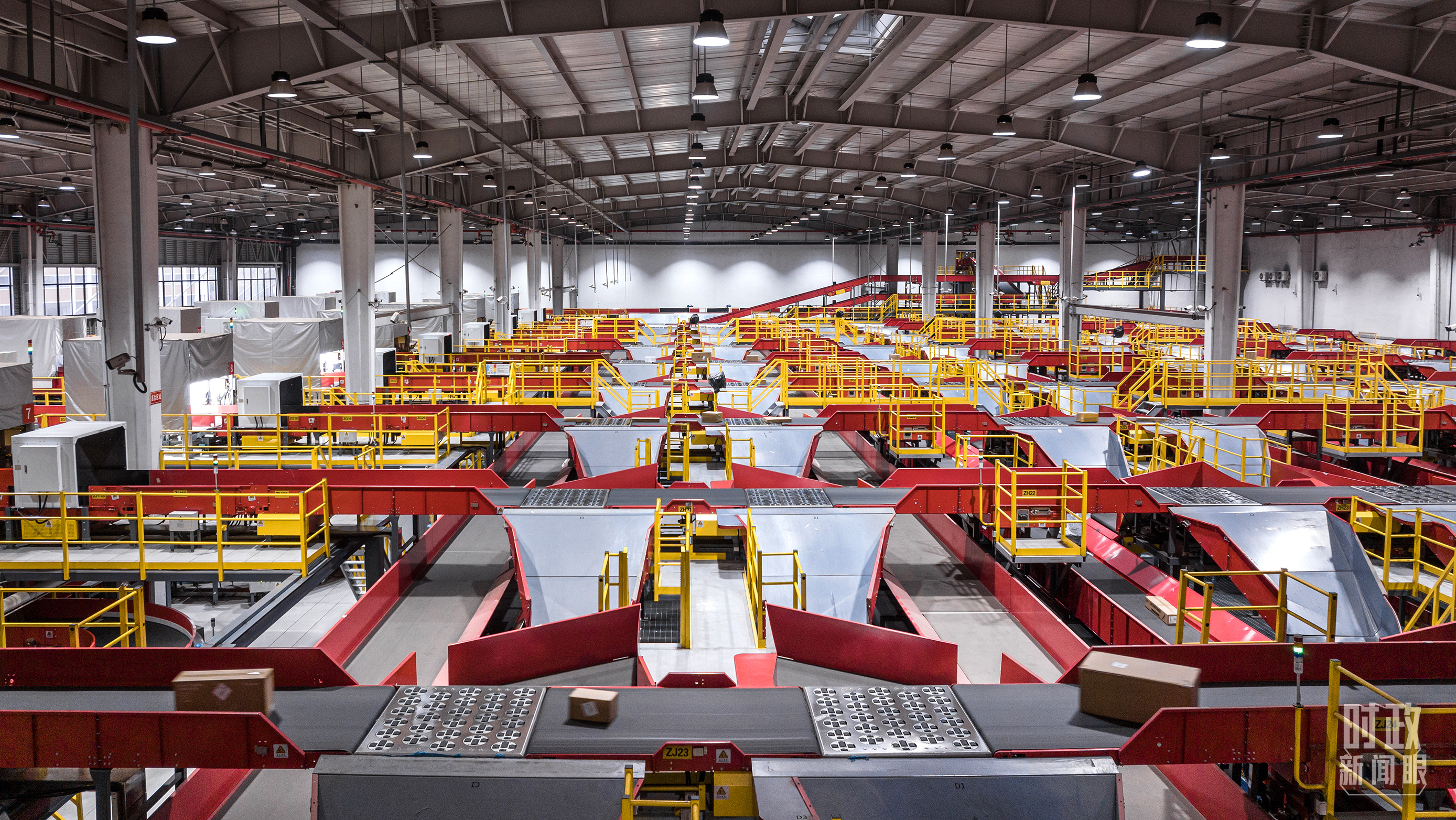 △浙江金華的快遞物流轉(zhuǎn)運(yùn)中心采用自動(dòng)流水線分揀機(jī)器人。(圖/視覺(jué)中國(guó))