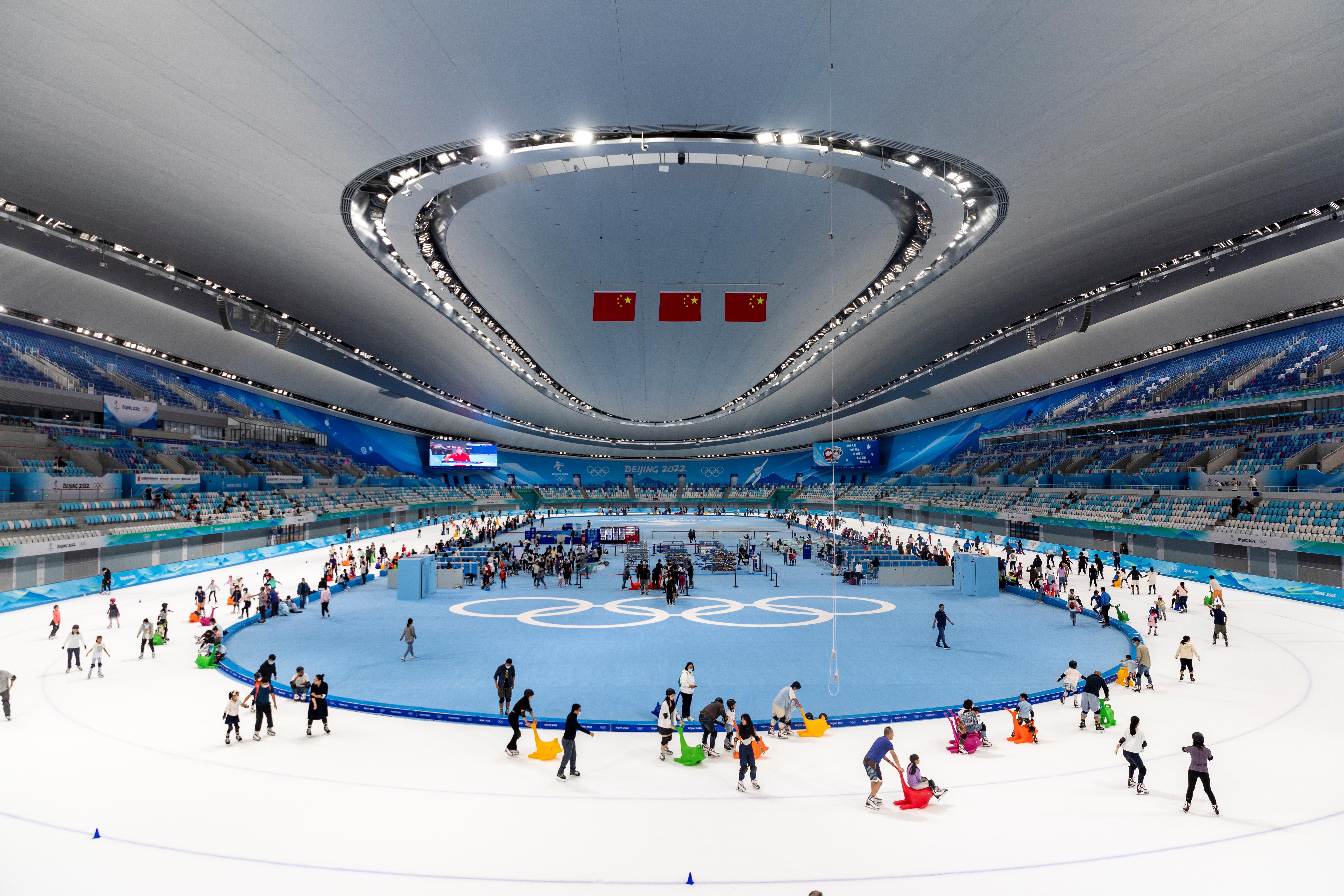 △市民在國家速滑館“冰絲帶”滑冰。