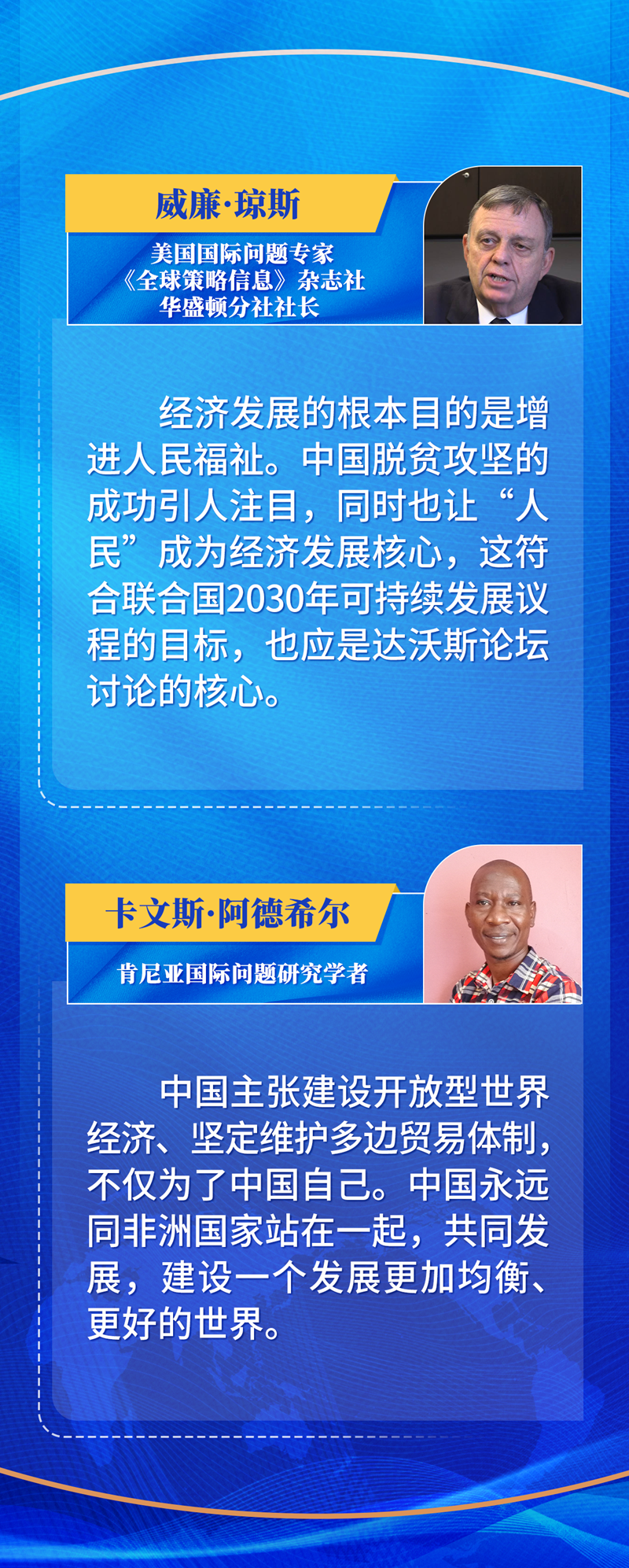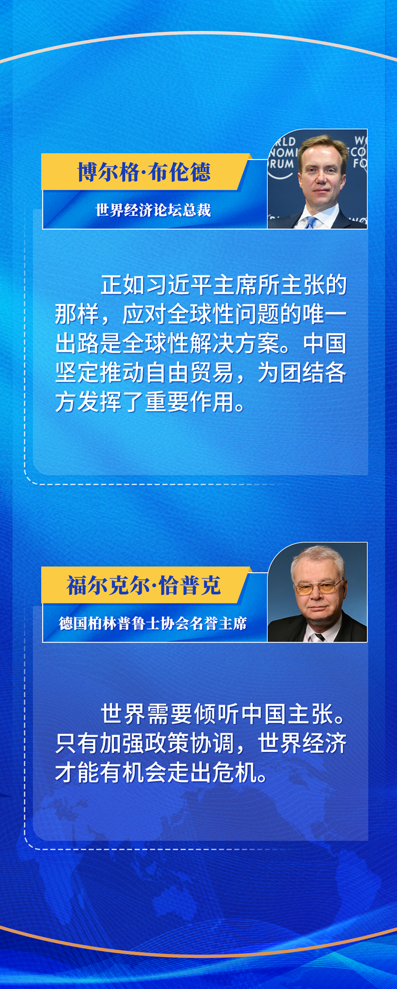 今年的達(dá)沃斯論壇年會(huì)以“在分裂的世界中加強(qiáng)合作”為主題。對(duì)習(xí)近平主席的主張,世界經(jīng)濟(jì)論壇總裁博爾格·布倫德深表認(rèn)同。他說(shuō),應(yīng)對(duì)全球性問(wèn)題的出路是全球性解決方案。“中國(guó)堅(jiān)定推動(dòng)自由貿(mào)易,為團(tuán)結(jié)各方發(fā)揮了重要作用。”