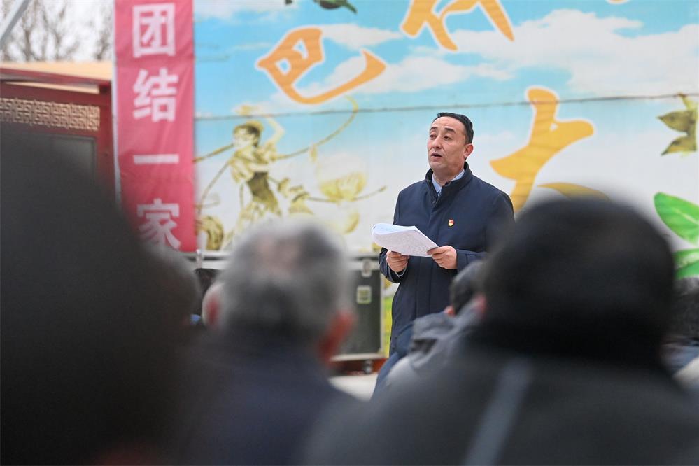 2月20日,在新疆和田地區(qū)策勒縣巴什玉吉買村村委會(huì),買買提依布熱依木·買買提明在升旗儀式后為村民宣講惠民政策。新華社記者 丁磊 攝