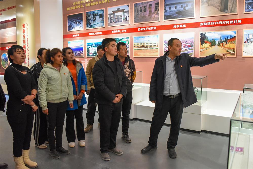 2月20日,在新疆和田地區(qū)策勒縣巴什玉吉買村的民族團(tuán)結(jié)館,買買提依布熱依木·買買提明(右一)向村里的年輕人介紹策勒縣的變化。新華社記者 丁磊 攝