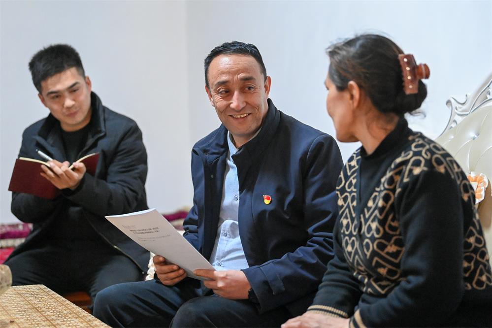 2月20日,新疆和田地區(qū)策勒縣巴什玉吉買村黨支部書(shū)記買買提依布熱依木·買買提明(中)在村民家走訪。新華社記者 丁磊 攝