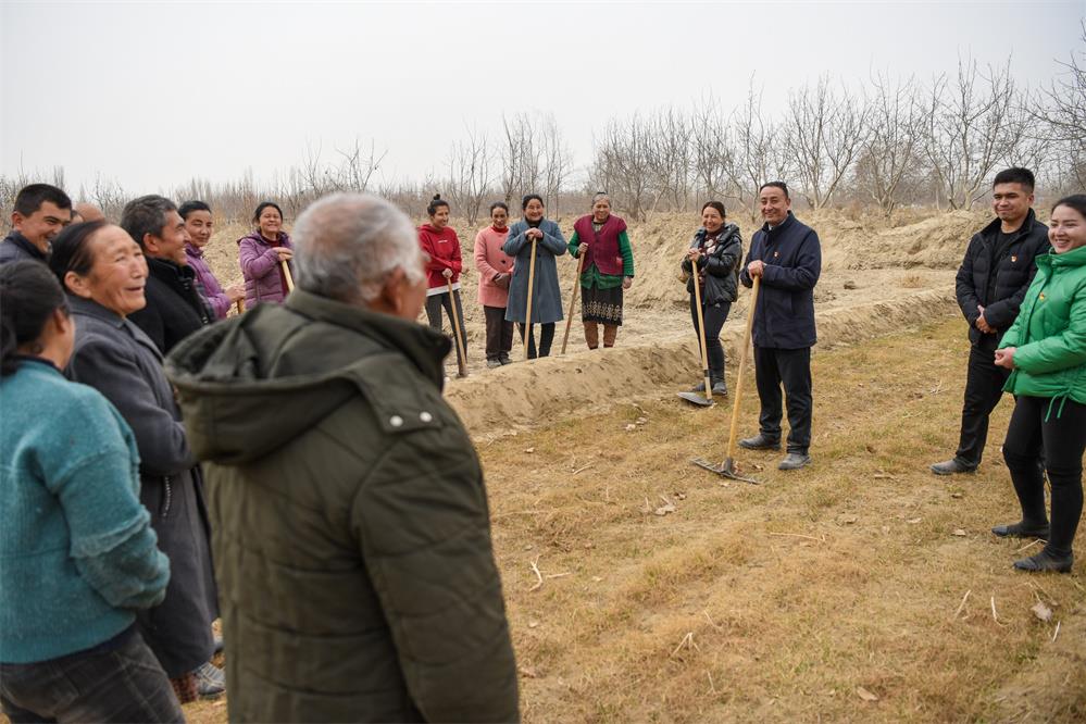 2月20日,在新疆和田地區(qū)策勒縣巴什玉吉買村,買買提依布熱依木·買買提明(中)和村民一起整理土地,為春耕生產(chǎn)做準(zhǔn)備。新華社記者 丁磊 攝