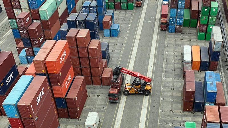 2023年2月15日,工人在廣西欽州港集裝箱碼頭駕駛裝卸車調運集裝箱(無人機照片)。