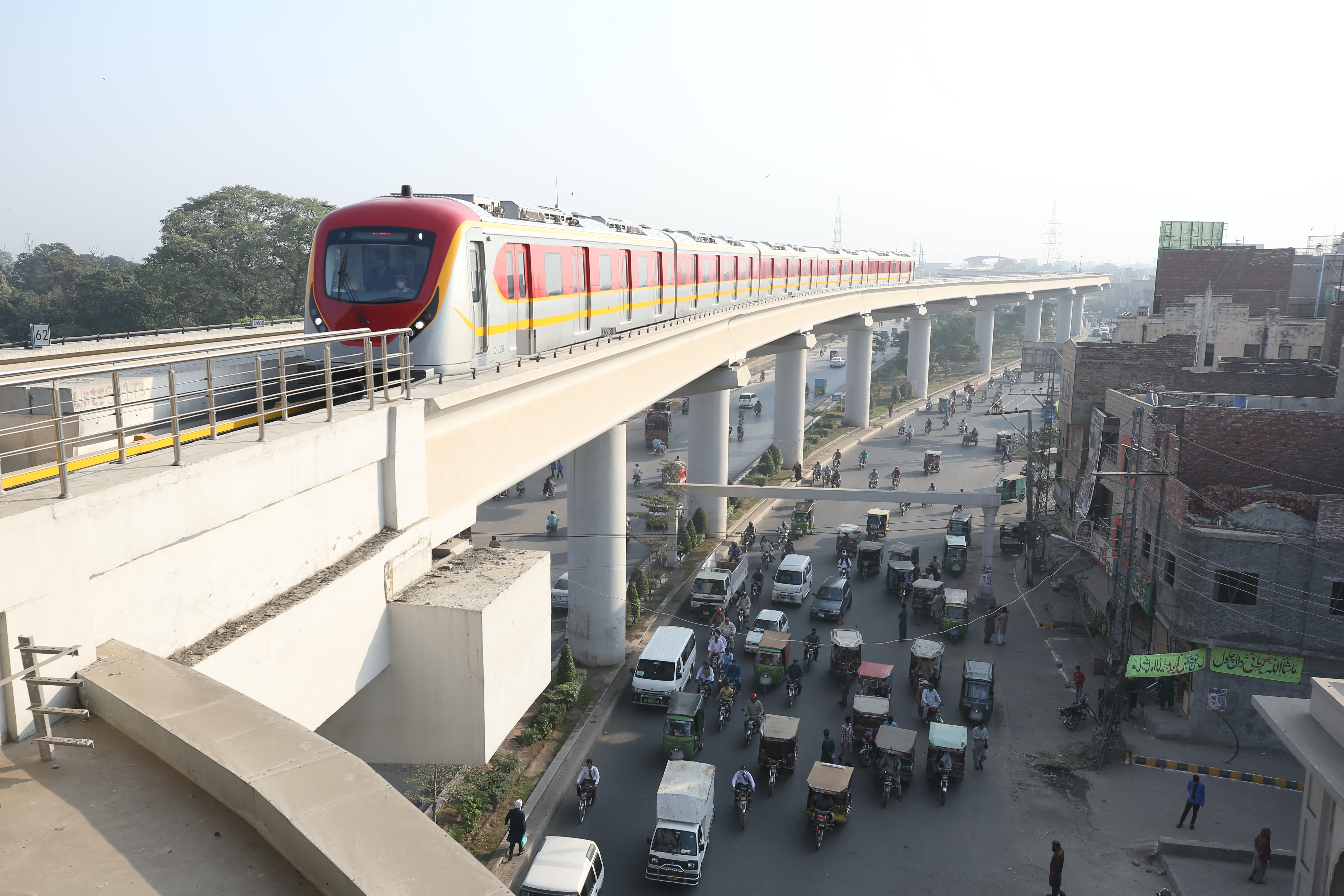 在巴基斯坦拉合爾市,巴基斯坦首條地鐵拉合爾橙線一輛地鐵列車準備進站(2020年10月26日攝)。新華社記者劉天攝