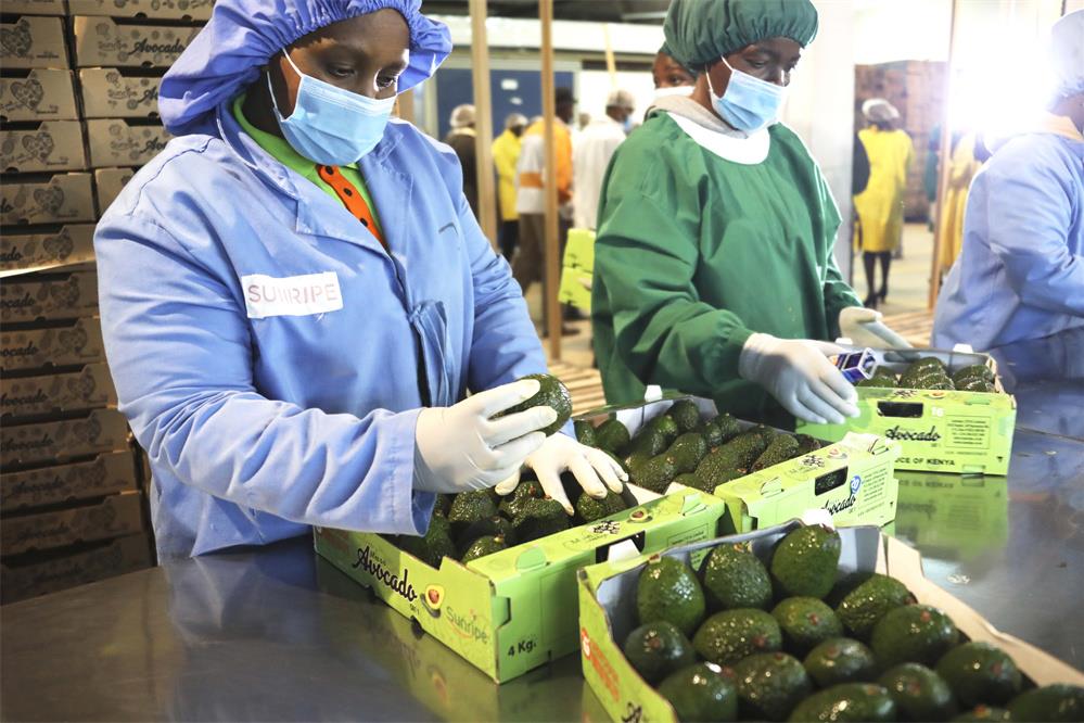 2022年8月2日,在位于肯尼亞利穆魯鎮(zhèn)的桑瑞普工廠,員工將牛油果裝箱。桑瑞普工廠當日舉行鮮食牛油果對華出口首發(fā)儀式,這是非洲鮮食牛油果首次出口中國。新華社記者 董江輝 攝
