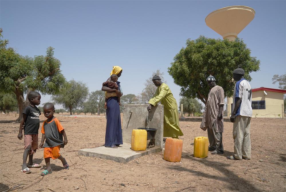 2023年3月20日,在塞內加爾久爾貝勒區(qū)的泰內富勒村,中地海外塞內加爾公司鄉(xiāng)村打井工程水井協(xié)調員幫助村民取水。新華社記者 韓旭 攝