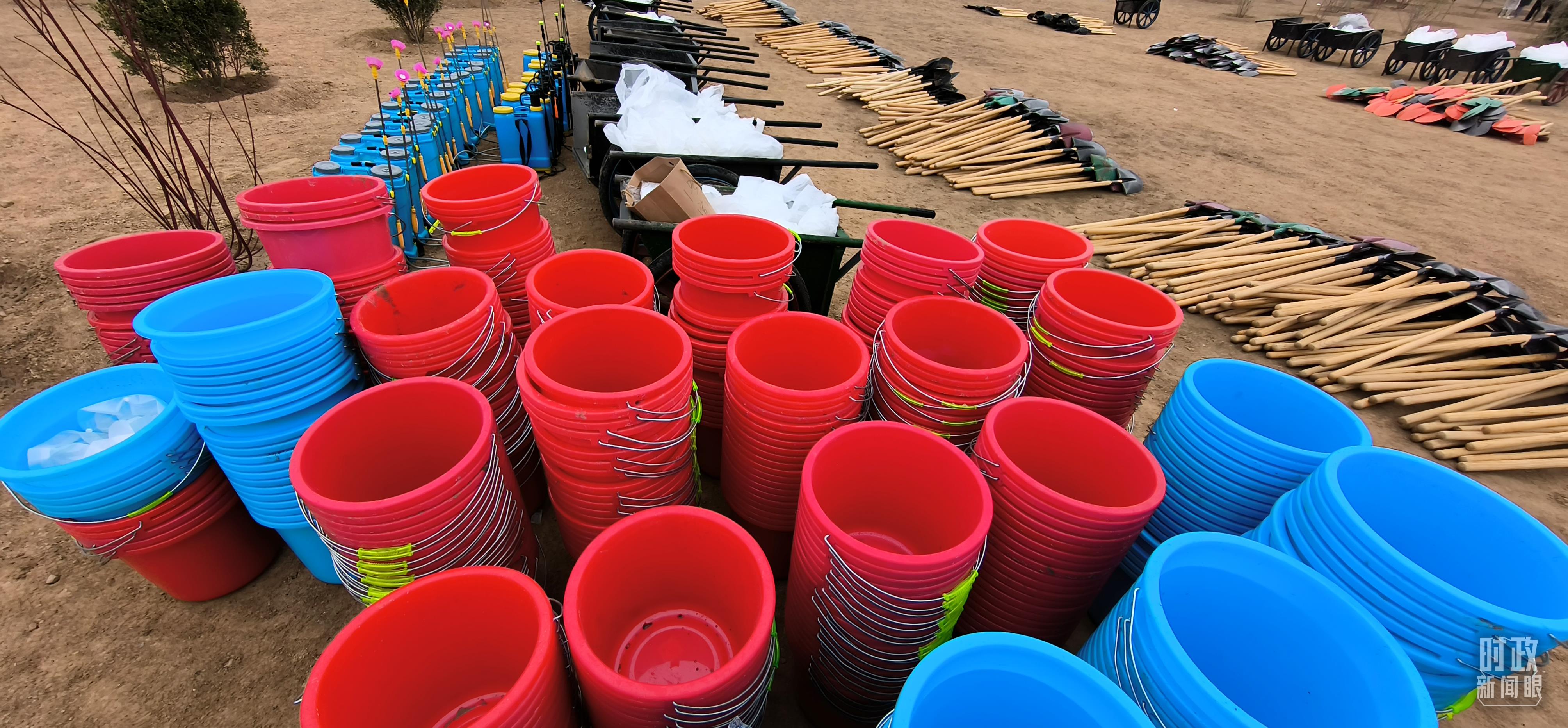 △植樹現(xiàn)場準備的鐵鍬、水桶等工具。(總臺央視記者郭鴻拍攝)