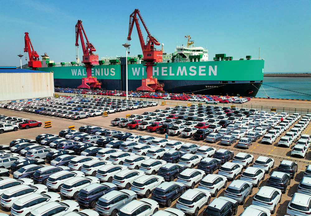 一艘滾裝船在江蘇連云港港東方港務(wù)分公司碼頭裝運(yùn)出口汽車(2023 年 5 月 16 日攝) 王健民攝 / 本刊