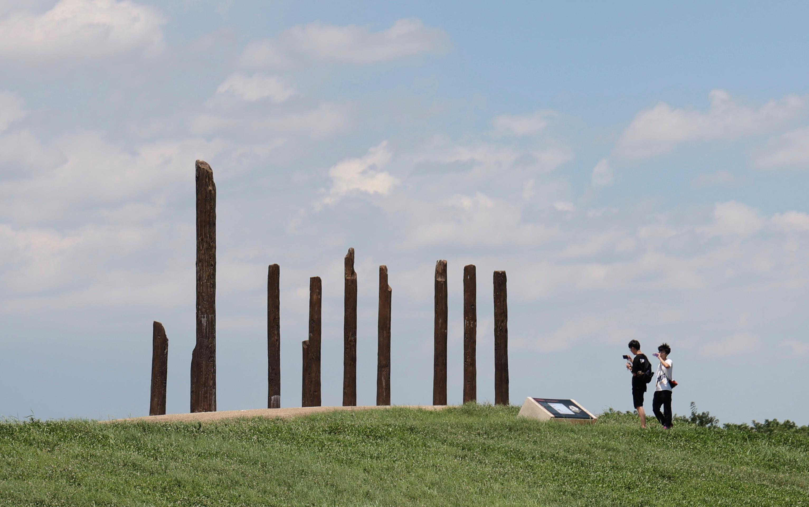 △游客在良渚古城遺址公園參觀莫角山遺址。