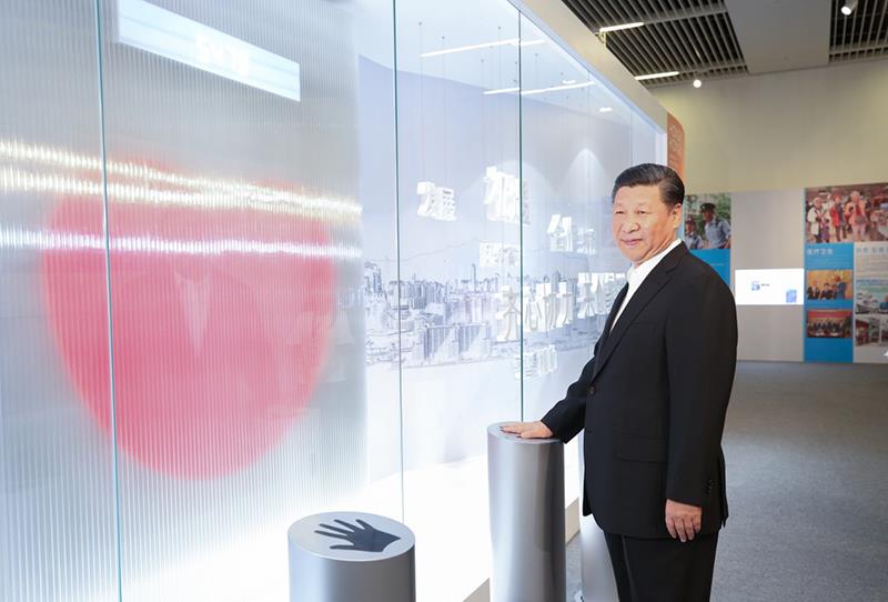 △2017年6月26日,習(xí)近平總書(shū)記在國(guó)家博物館參觀香港回歸祖國(guó)20周年成就展,并按下“同心圓”互動(dòng)裝置的觸摸板。