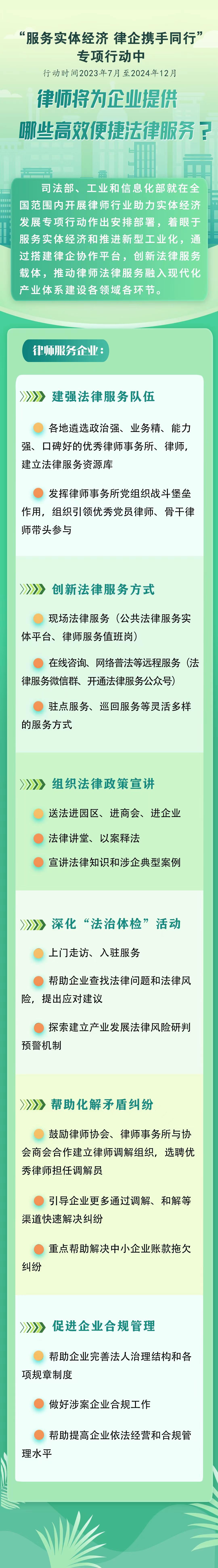 方案要求,各地司法行政部門、工業(yè)和信息化主管部門、通信管理局和律師協(xié)會要共同組織優(yōu)秀律師事務所和律師,為工業(yè)和信息化領域相關企業(yè)提供全業(yè)務、全時空、高效便捷的法律服務?;顒又?,要摸清各類企業(yè)法律服務需求,建強法律服務隊伍,創(chuàng)新法律服務方式,通過開展法律政策宣講、深化“法治體檢”活動等形式,推動律師行業(yè)服務實體經濟的廣度和深度不斷拓展,服務的專業(yè)性、精準性、便捷性、實效性不斷增強,幫助企業(yè)化解法律風險,解決法律問題,維護合法權益,提升依法合規(guī)經營管理水平。