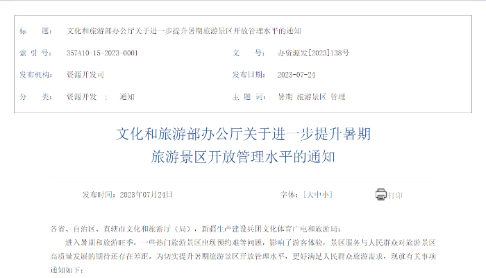 通知中稱,進入暑期和旅游旺季,一些熱門旅游景區(qū)出現(xiàn)預約難等問題,影響了游客體驗,景區(qū)服務與人民群眾對旅游景區(qū)高質量發(fā)展的期待還存在差距。為切實提升暑期旅游景區(qū)開放管理水平,更好滿足人民群眾旅游需求,現(xiàn)就有關事項通知如下: