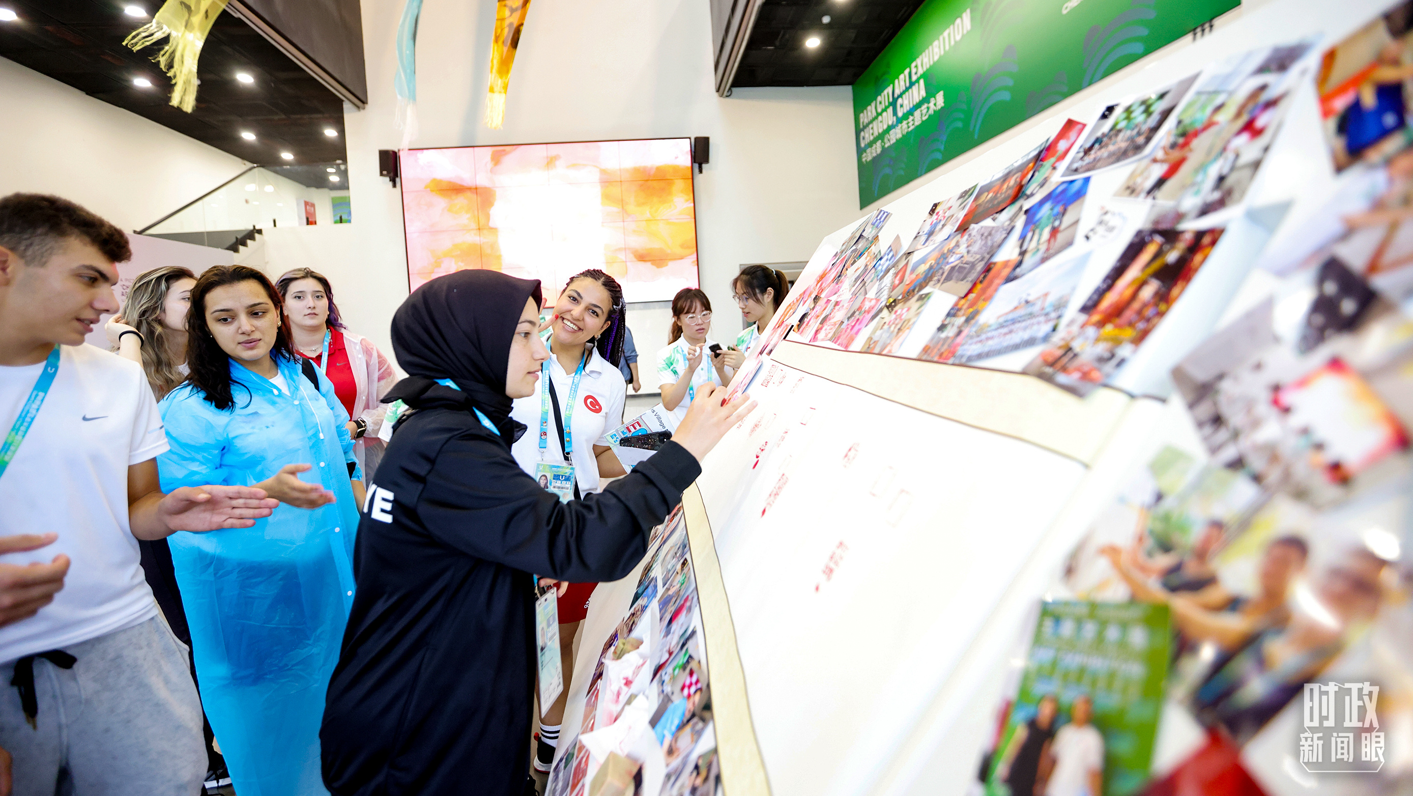 △各國青年運(yùn)動員正在參觀成都大運(yùn)村內(nèi)的“雪山下的公園城市,煙火里的幸福成都”主題藝術(shù)展。(總臺央視記者魏幫軍拍攝)