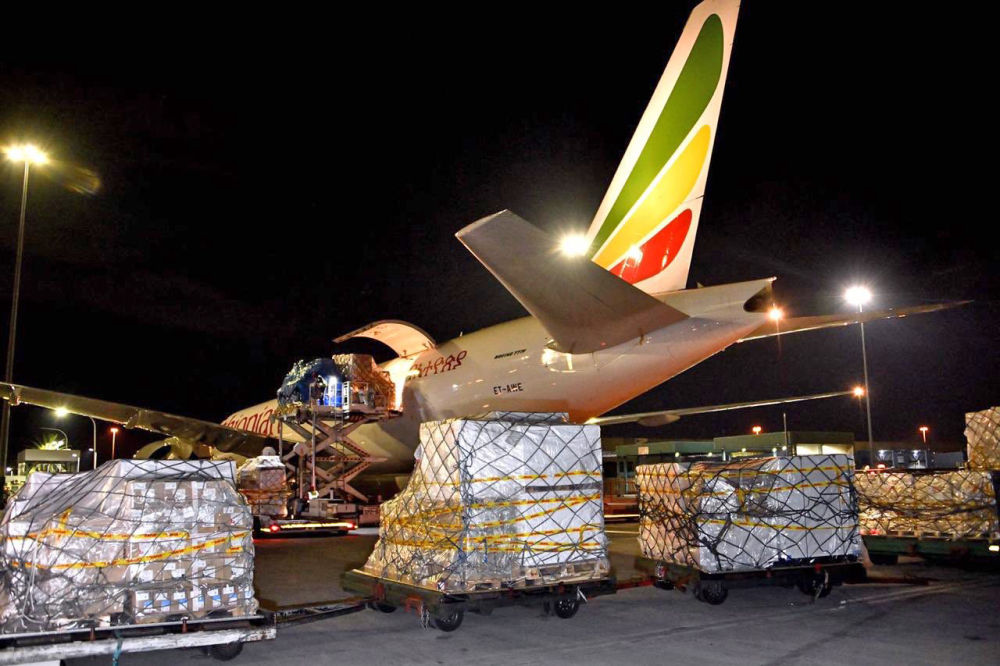 中國(guó)援助的抗疫物資抵達(dá)南非約翰內(nèi)斯堡(2020年4月14日攝)。