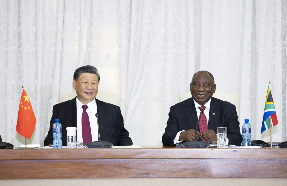 當(dāng)?shù)貢r(shí)間8月22日上午,正在南非進(jìn)行國(guó)事訪問的國(guó)家主席習(xí)近平在比勒陀利亞總統(tǒng)府同南非總統(tǒng)拉馬福薩會(huì)談。