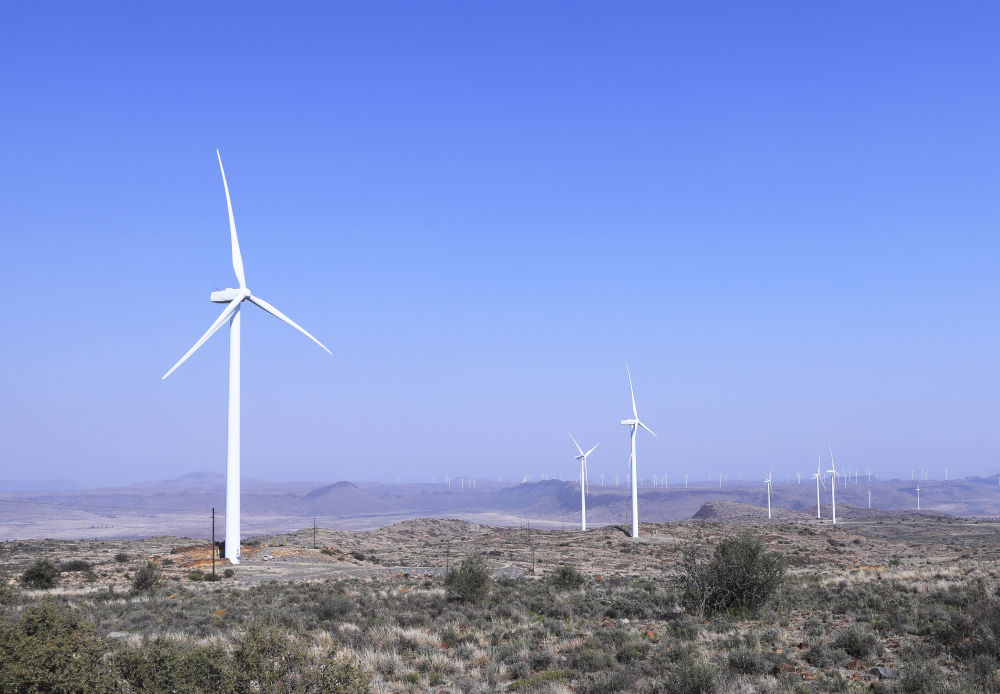 這是在南非北開普省德阿鎮(zhèn)拍攝的德阿風(fēng)電項(xiàng)目風(fēng)機(jī)(2023年8月10日攝)。由中國(guó)龍?jiān)措娏瘓F(tuán)南非公司運(yùn)營(yíng)的德阿風(fēng)電項(xiàng)目每年發(fā)電量超過7.5億千瓦時(shí),相當(dāng)于節(jié)約20多萬(wàn)噸標(biāo)準(zhǔn)煤,減排二氧化碳約70萬(wàn)噸。
