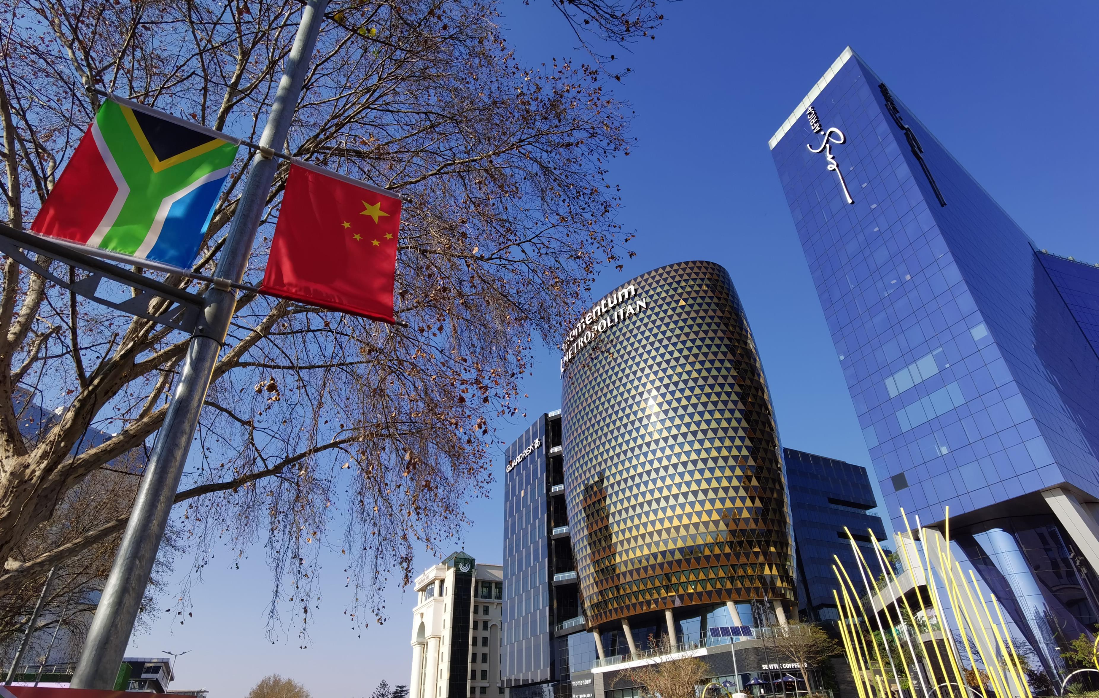 △南非約翰內(nèi)斯堡街頭懸掛著中國和南非兩國國旗