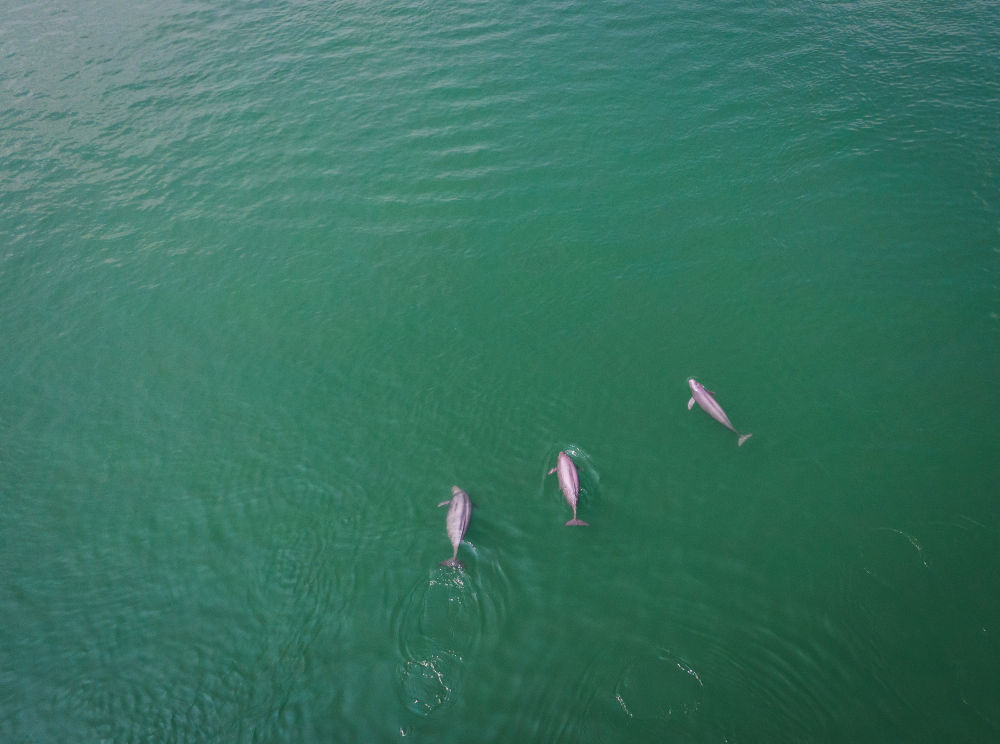 這是2021年5月11日在湖北省宜昌市拍攝的在水中嬉戲的長(zhǎng)江江豚(無(wú)人機(jī)照片)。新華社記者 肖藝九 攝