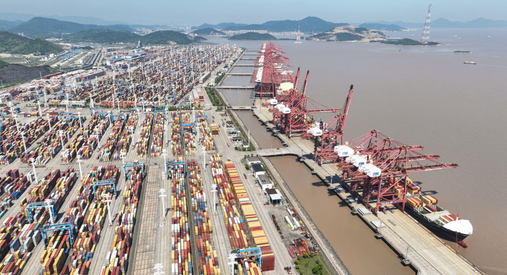 貨輪??吭趯幉ㄖ凵礁鄞┥礁蹍^(qū)裝卸貨物(2023年5月9日攝,無(wú)人機(jī)照片)。新華社記者 翁忻旸 攝