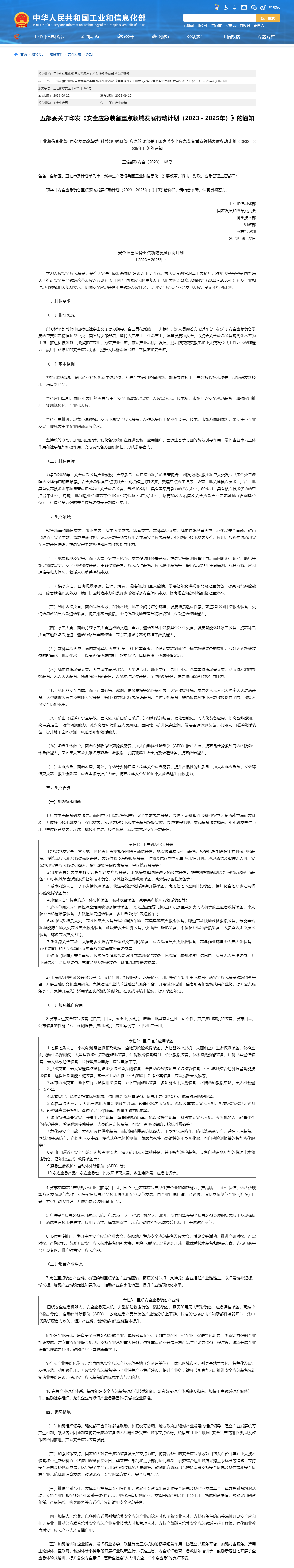 工信部官網(wǎng)消息,近日,工業(yè)和信息化部、國(guó)家發(fā)展改革委、科技部、財(cái)政部、應(yīng)急管理部等五部門聯(lián)合印發(fā)《安全應(yīng)急裝備重點(diǎn)領(lǐng)域發(fā)展行動(dòng)計(jì)劃(2023-2025年)》。其中提出,力爭(zhēng)到2025年,安全應(yīng)急裝備產(chǎn)業(yè)規(guī)模、產(chǎn)品質(zhì)量、應(yīng)用深度和廣度顯著提升,對(duì)防災(zāi)減災(zāi)救災(zāi)和重大突發(fā)公共事件處置保障的支撐作用明顯增強(qiáng)。安全應(yīng)急裝備重點(diǎn)領(lǐng)域產(chǎn)業(yè)規(guī)模超過1萬億元。聚焦重點(diǎn)應(yīng)用場(chǎng)景,攻克一批關(guān)鍵核心技術(shù),推廣一批具有較高技術(shù)水平和顯著應(yīng)用成效的安全應(yīng)急裝備,形成10家以上具有國(guó)際競(jìng)爭(zhēng)力的龍頭企業(yè)、50家以上具有核心技術(shù)優(yōu)勢(shì)的重點(diǎn)骨干企業(yè),涌現(xiàn)一批制造業(yè)單項(xiàng)冠軍企業(yè)和專精特新“小巨人”企業(yè),培育50家左右國(guó)家安全應(yīng)急產(chǎn)業(yè)示范基地(含創(chuàng)建單位),打造競(jìng)爭(zhēng)力強(qiáng)的安全應(yīng)急裝備先進(jìn)制造業(yè)集群。