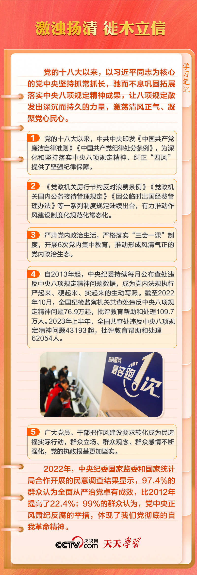 天天學(xué)習(xí)在二十屆中央紀(jì)委二次全會(huì)上,習(xí)近平總書記指出:“制定實(shí)施中央八項(xiàng)規(guī)定,是我們黨在新時(shí)代的徙木立信之舉,必須常抓不懈、久久為功,直至真正化風(fēng)成俗,以優(yōu)良黨風(fēng)引領(lǐng)社風(fēng)民風(fēng)。”