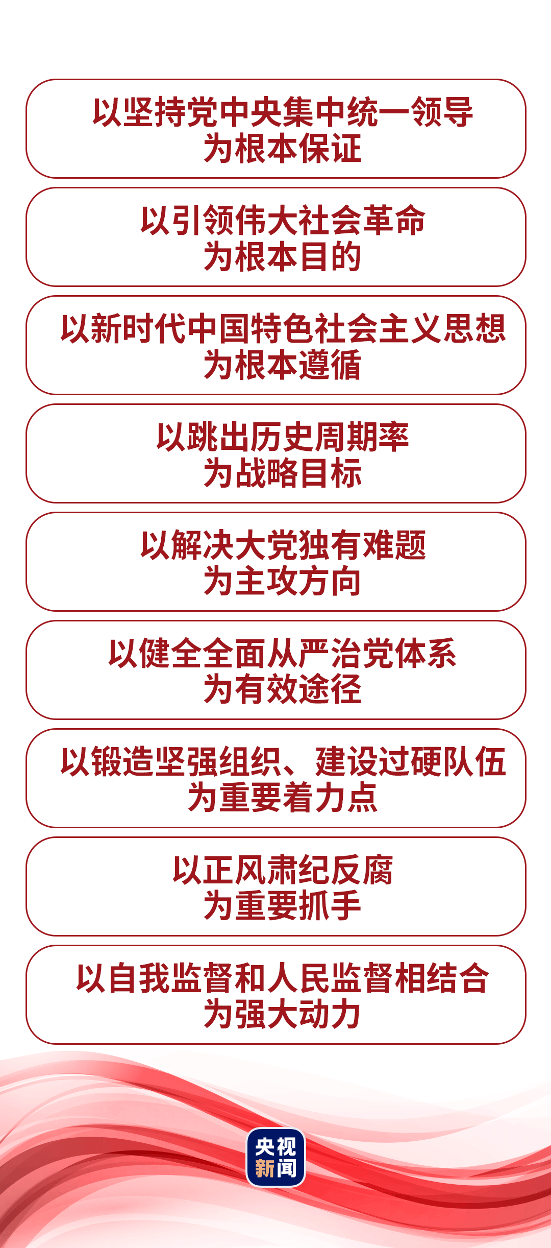 “黨的十八大以來(lái),在推進(jìn)全面從嚴(yán)治黨的偉大實(shí)踐中,我們不斷進(jìn)行實(shí)踐探索和理論思考,在毛澤東同志當(dāng)年給出‘讓人民來(lái)監(jiān)督政府’的第一個(gè)答案基礎(chǔ)上,給出了第二個(gè)答案,那就是不斷推進(jìn)黨的自我革命。”2024年1月8日,在二十屆中央紀(jì)委三次全會(huì)上,習(xí)近平總書(shū)記發(fā)表重要講話(huà),深刻闡述黨的自我革命的重要思想,明確提出“九個(gè)以”的實(shí)踐要求,為新時(shí)代新征程深入推進(jìn)全面從嚴(yán)治黨、黨風(fēng)廉政建設(shè)和反腐敗斗爭(zhēng)提供根本遵循。