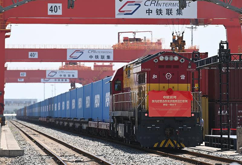 △2023年8月3日,中歐班列(西安-塔什干)陜?yōu)踅?jīng)貿(mào)合作隆基綠能光伏組件出口專列在西安國際港站準備發(fā)車。