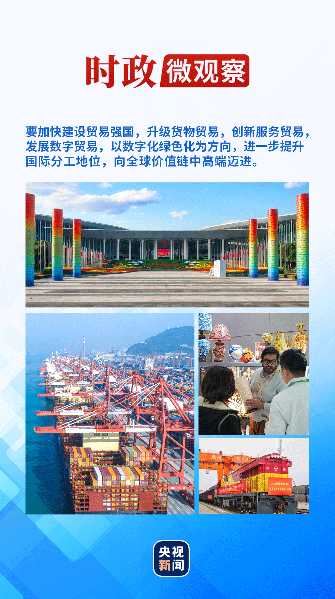 習(xí)近平總書記強調(diào):“要加快建設(shè)貿(mào)易強國,升級貨物貿(mào)易,創(chuàng)新服務(wù)貿(mào)易,發(fā)展數(shù)字貿(mào)易,以數(shù)字化綠色化為方向,進一步提升國際分工地位,向全球價值鏈中高端邁進。”