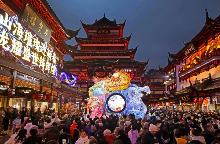 2024年1月21日,游客在豫園商城中心廣場賞燈拍照。當日,2024上海豫園民俗藝術(shù)燈會正式亮燈。今年豫園燈會續(xù)寫“山海奇豫記”,以“海經(jīng)篇”為主題,生肖龍燈、海底世界、魚群起舞、奇幻仙境等場景讓游客在燈火絢爛的國風幻境中喜迎龍年新春。新華社記者 劉穎 攝