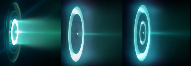 ▲嵌套式霍爾推力器點(diǎn)火圖像(左:內(nèi)環(huán)工作,中:外環(huán)工作,右:雙環(huán)同時工作)