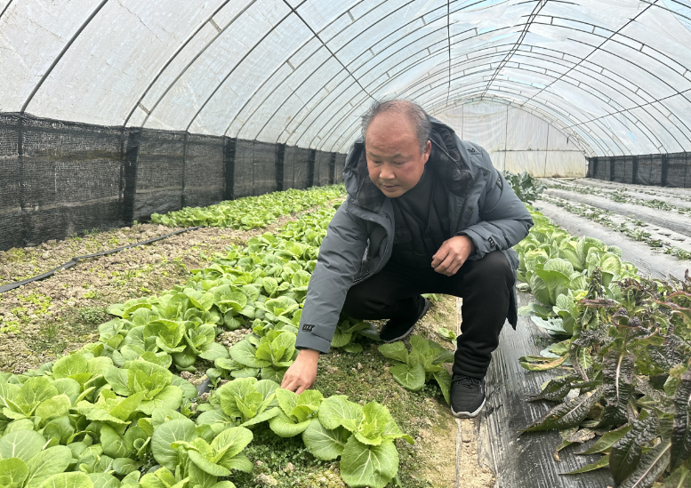 李明新在大棚里觀察蔬菜長(zhǎng)勢(shì)