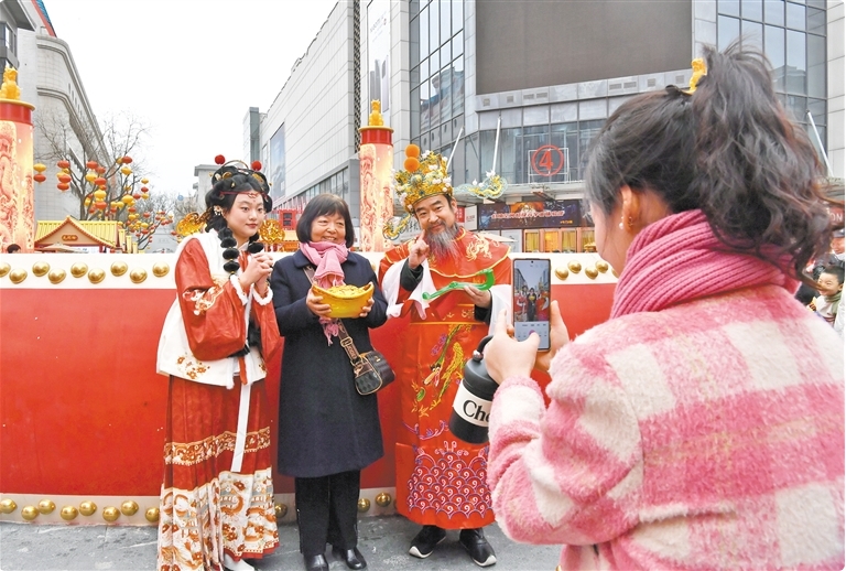 2月14日,西安市新城區(qū)“皇城里·民樂園首屆新春文化節(jié)”現(xiàn)場熱鬧非凡,“請財(cái)神”、耍社火等民俗表演輪番上演。圖為市民與“財(cái)神”合影留念。 記者 蒲茜攝