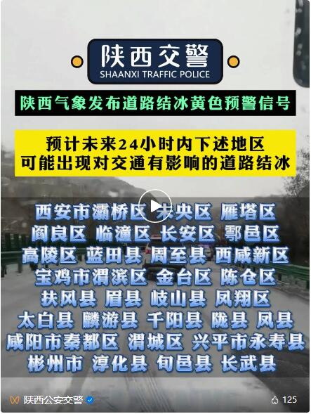 預(yù)計(jì)未來(lái)24小時(shí)內(nèi)下述地區(qū)可能出現(xiàn)對(duì)交通有影響的道路結(jié)冰:西安市灞橋區(qū)、未央?yún)^(qū)、雁塔區(qū)、閻良區(qū)、臨潼區(qū)、長(zhǎng)安區(qū)、鄠邑區(qū)、高陵區(qū)、藍(lán)田縣、周至縣、西咸新區(qū),寶雞市渭濱區(qū)、金臺(tái)區(qū)、陳倉(cāng)區(qū)、扶風(fēng)縣、眉縣、岐山縣、鳳翔區(qū)、太白縣、麟游縣、千陽(yáng)縣、隴縣、鳳縣,咸陽(yáng)市秦都區(qū)、渭城區(qū)、興平市、武功縣、三原縣、涇陽(yáng)縣、禮泉縣、乾縣、永壽縣、彬州市、淳化縣、旬邑縣、長(zhǎng)武縣,銅川市王益區(qū)、印臺(tái)區(qū)、耀州區(qū)、宜君縣,渭南市臨渭區(qū)、華陰市、華州區(qū)、潼關(guān)縣、大荔縣、澄城縣、合陽(yáng)縣、蒲城縣、富平縣、白水縣,延安市寶塔區(qū)、安塞區(qū)、黃陵縣、黃龍縣、宜川縣、洛川縣、富縣、甘泉縣、吳起縣、志丹縣、子長(zhǎng)市、延川縣、延長(zhǎng)縣,榆林市榆陽(yáng)區(qū)、橫山區(qū)、神木市、府谷縣、定邊縣、靖邊縣、綏德縣、米脂縣、佳縣、吳堡縣、清澗縣、子洲縣,漢中市南鄭區(qū)、城固縣、洋縣、勉縣、西鄉(xiāng)縣、略陽(yáng)縣、鎮(zhèn)巴縣、寧強(qiáng)縣、留壩縣、佛坪縣,安康市漢濱區(qū)、漢陰縣、石泉縣、寧陜縣、紫陽(yáng)縣、嵐皋縣、平利縣、鎮(zhèn)坪縣、旬陽(yáng)市、白河縣,商洛市商州區(qū)、洛南縣、山陽(yáng)縣、鎮(zhèn)安縣、丹鳳縣、商南縣、柞水縣,楊凌示范區(qū)楊陵區(qū),韓城市,請(qǐng)注意防范。