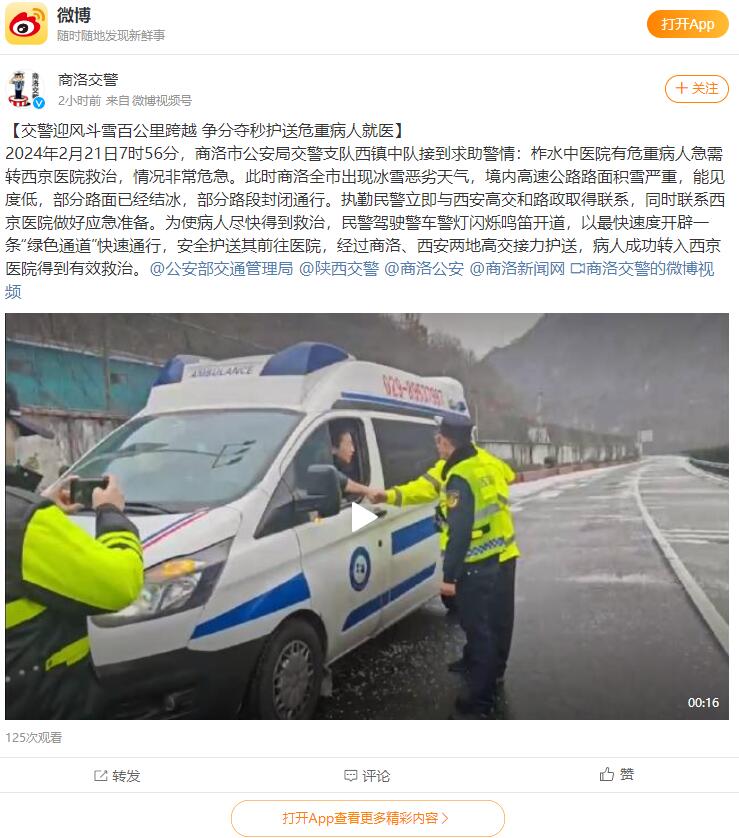 2024年2月21日7時56分,商洛市公安局交警支隊西鎮(zhèn)中隊接到求助警情:柞水中醫(yī)院有危重病人急需轉西京醫(yī)院救治,情況非常危急。此時商洛全市出現(xiàn)冰雪惡劣天氣,境內高速公路路面積雪嚴重,能見度低,部分路面已經(jīng)結冰,部分路段封閉通行。執(zhí)勤民警立即與西安高交和路政取得聯(lián)系,同時聯(lián)系西京醫(yī)院做好應急準備。為使病人盡快得到救治,民警駕駛警車警燈閃爍鳴笛開道,以最快速度開辟一條“綠色通道”快速通行,安全護送其前往醫(yī)院,經(jīng)過商洛、西安兩地高交接力護送,病人成功轉入西京醫(yī)院得到有效救治。