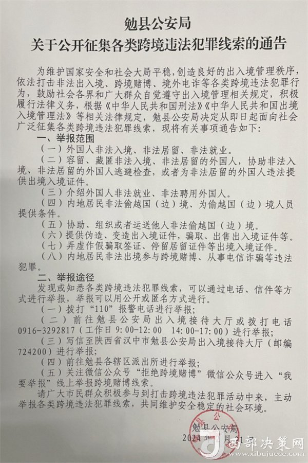西部決策網(wǎng)訊 為維護國家安全和社會大局平穩(wěn),創(chuàng)造良好的出入境管理秩序,依法打擊非法出入境、跨境賭博、境外電詐等各類跨境違法犯罪行為,鼓勵社會各界和廣大群眾自覺遵守出入境管理相關規(guī)定,積極履行法律義務,根據(jù)《中華人民共和國刑法》《中華人民共和國出境入境管理法》等相關法律規(guī)定,勉縣公安局決定從即日起面向社會廣泛征集各類跨境違法犯罪線索,現(xiàn)將有關事項通告如下: