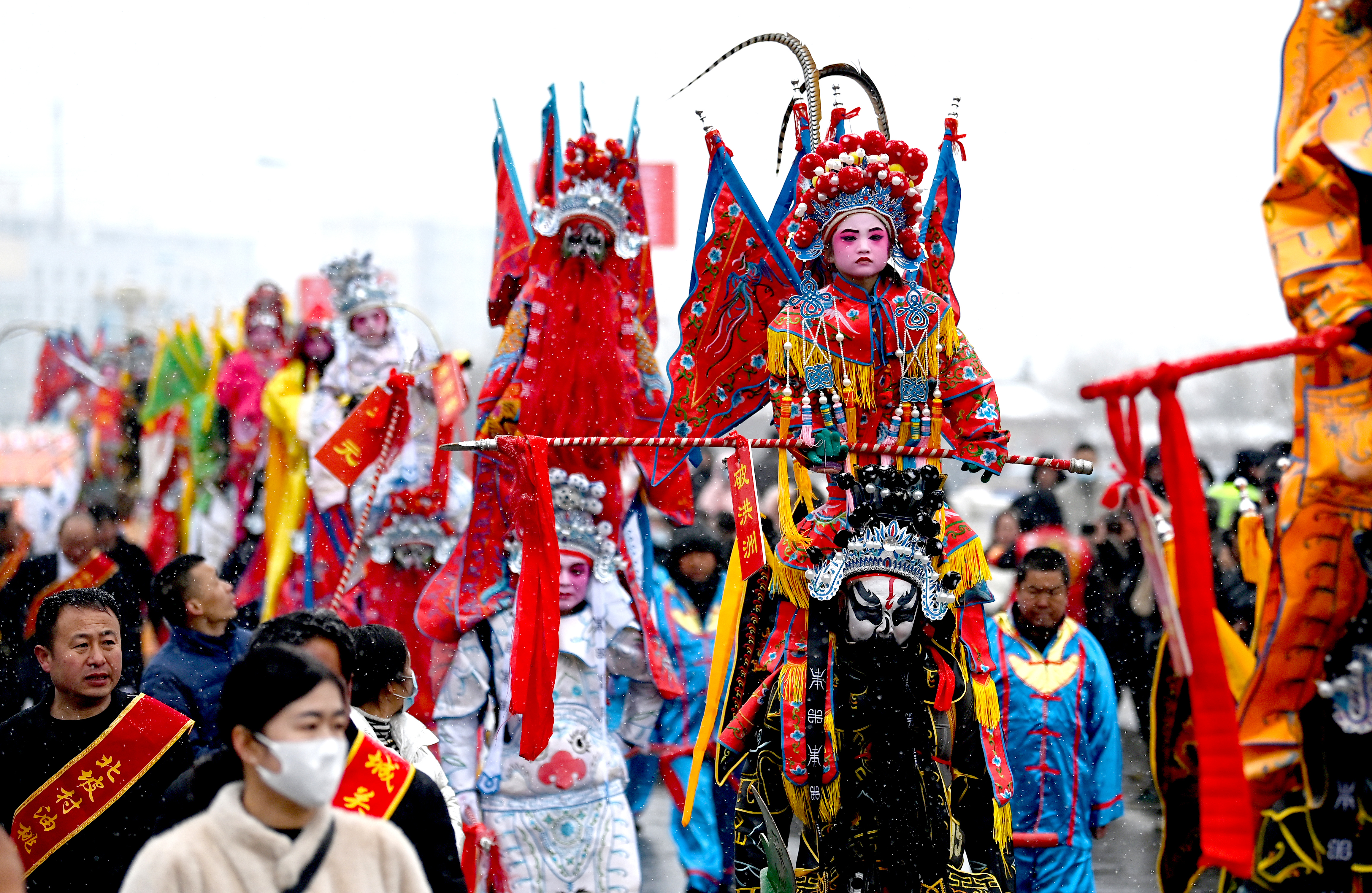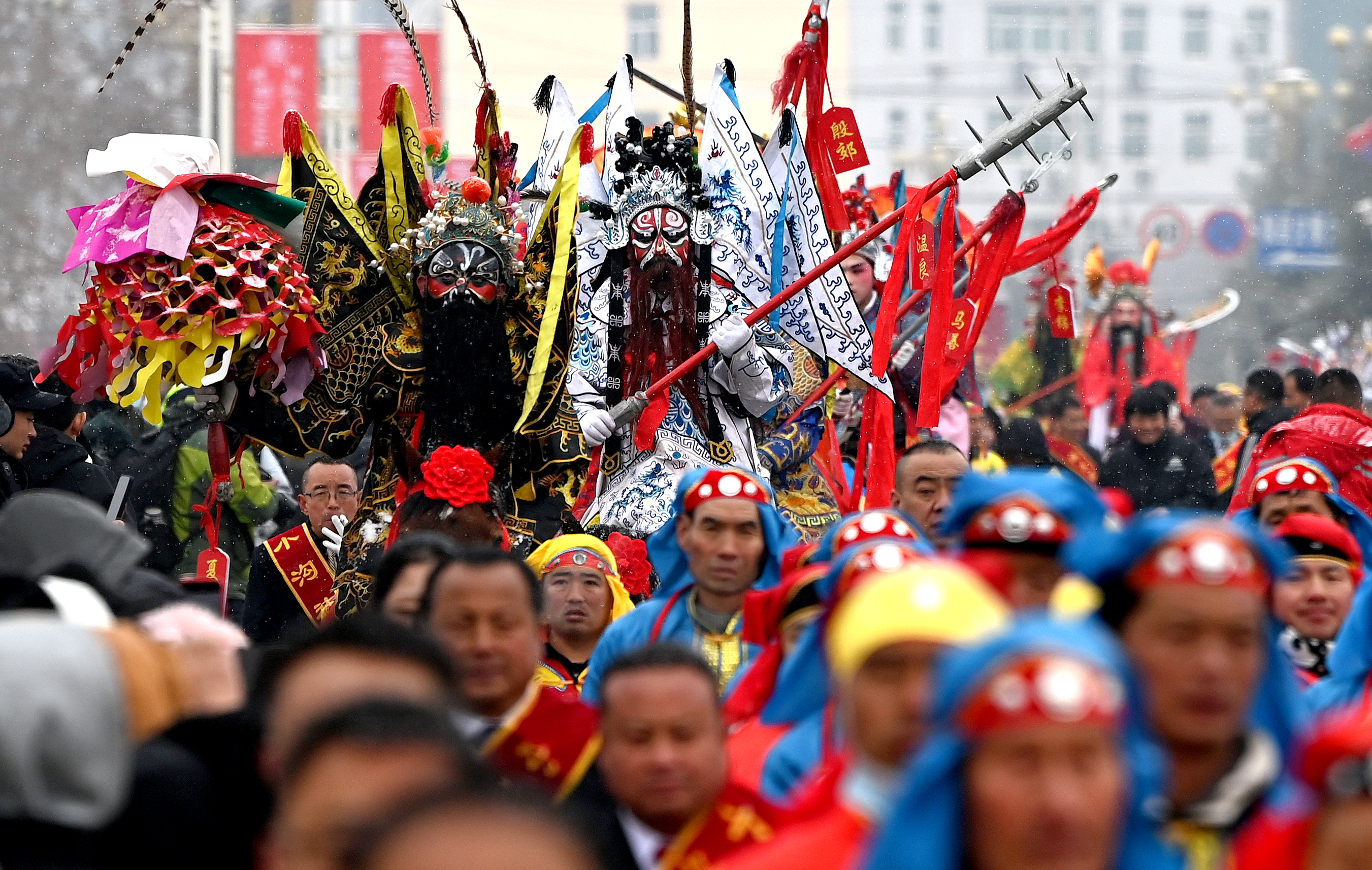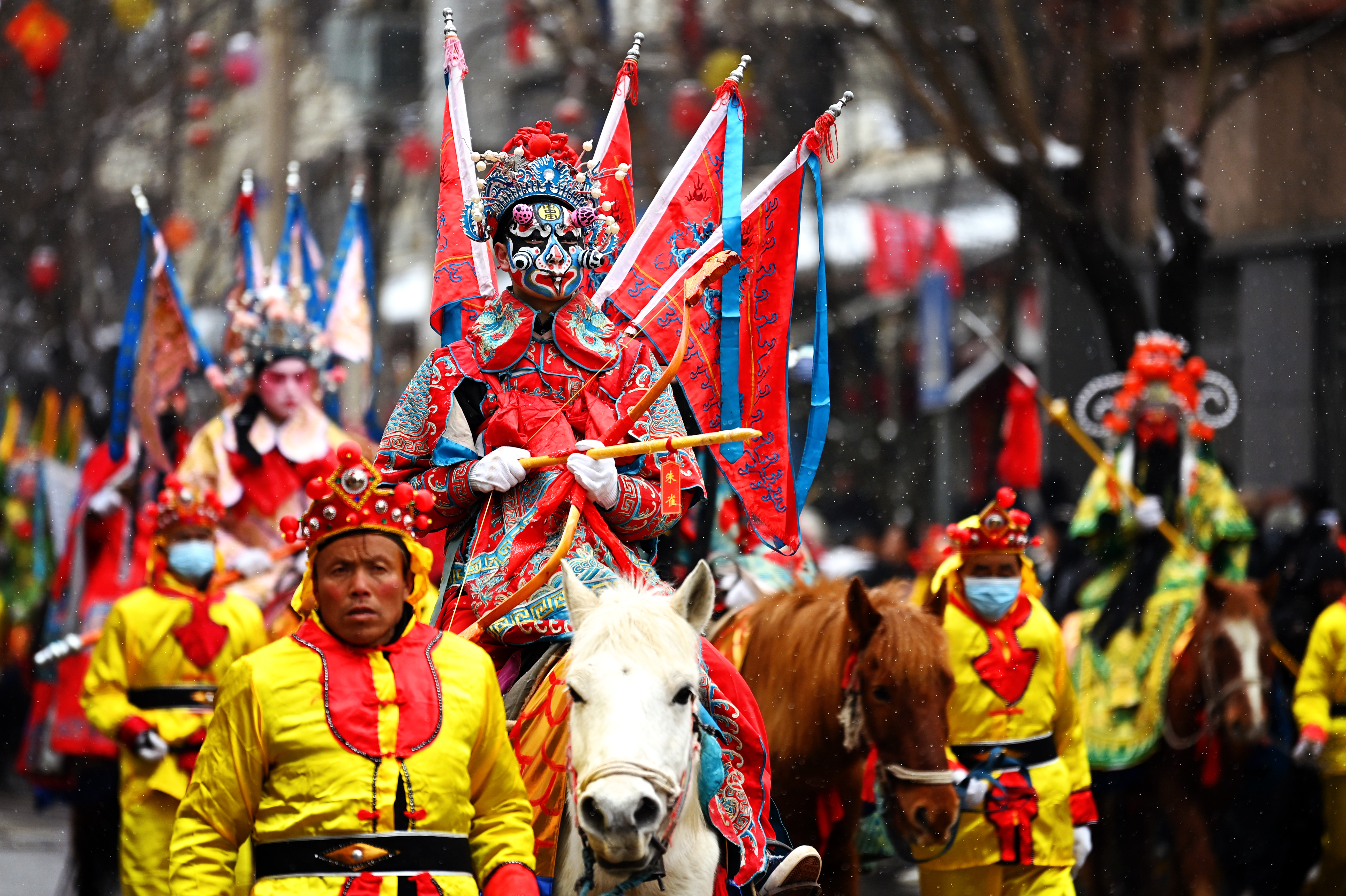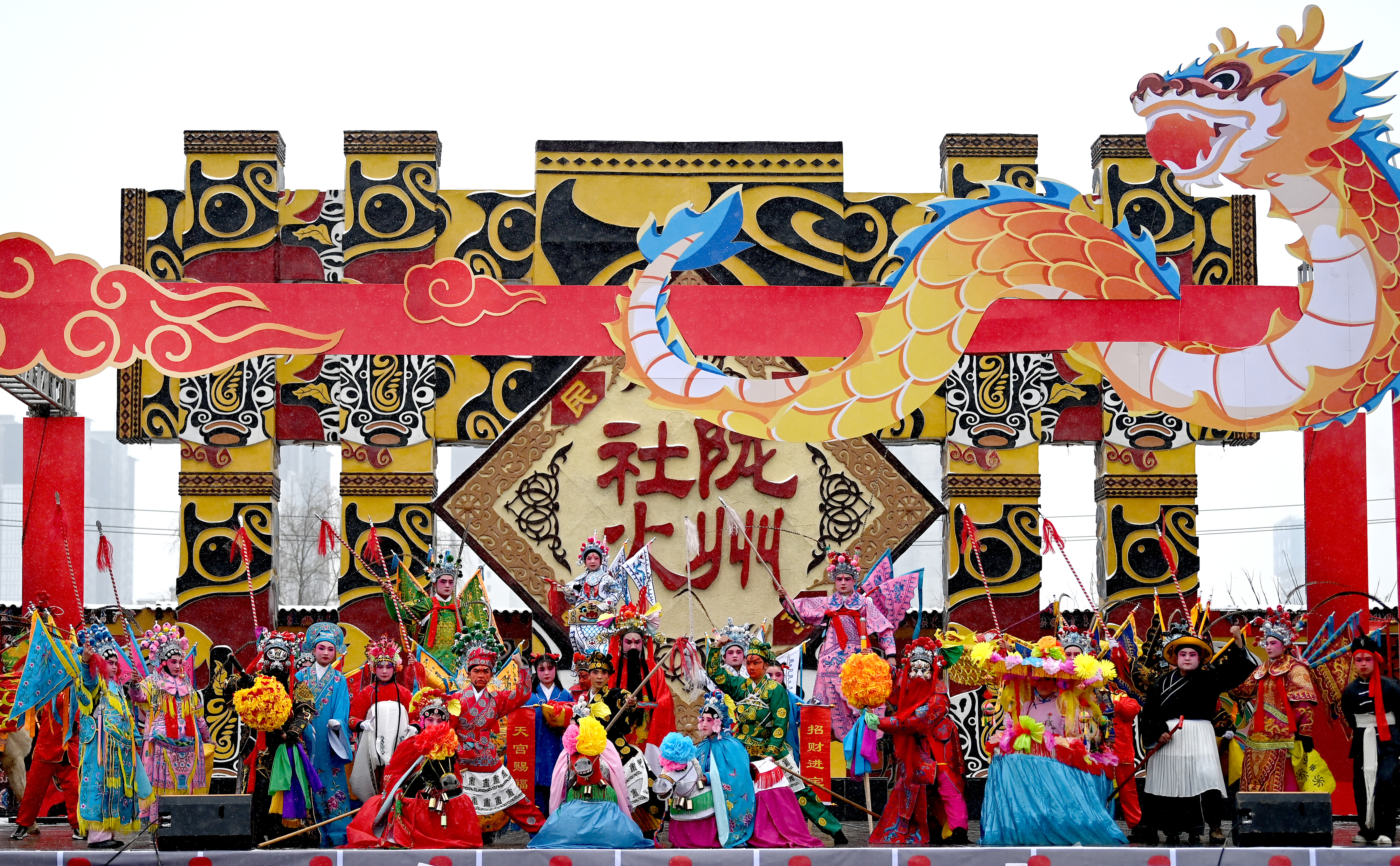 當(dāng)日是農(nóng)歷正月十三,來(lái)自陜西各地市的民間社火代表隊(duì)齊聚陜西隴縣,進(jìn)行社火展演及巡游活動(dòng)。在陜西,每年春節(jié)期間人們紛紛裝扮社火,走鄉(xiāng)串戶,進(jìn)行拜年迎春游演。