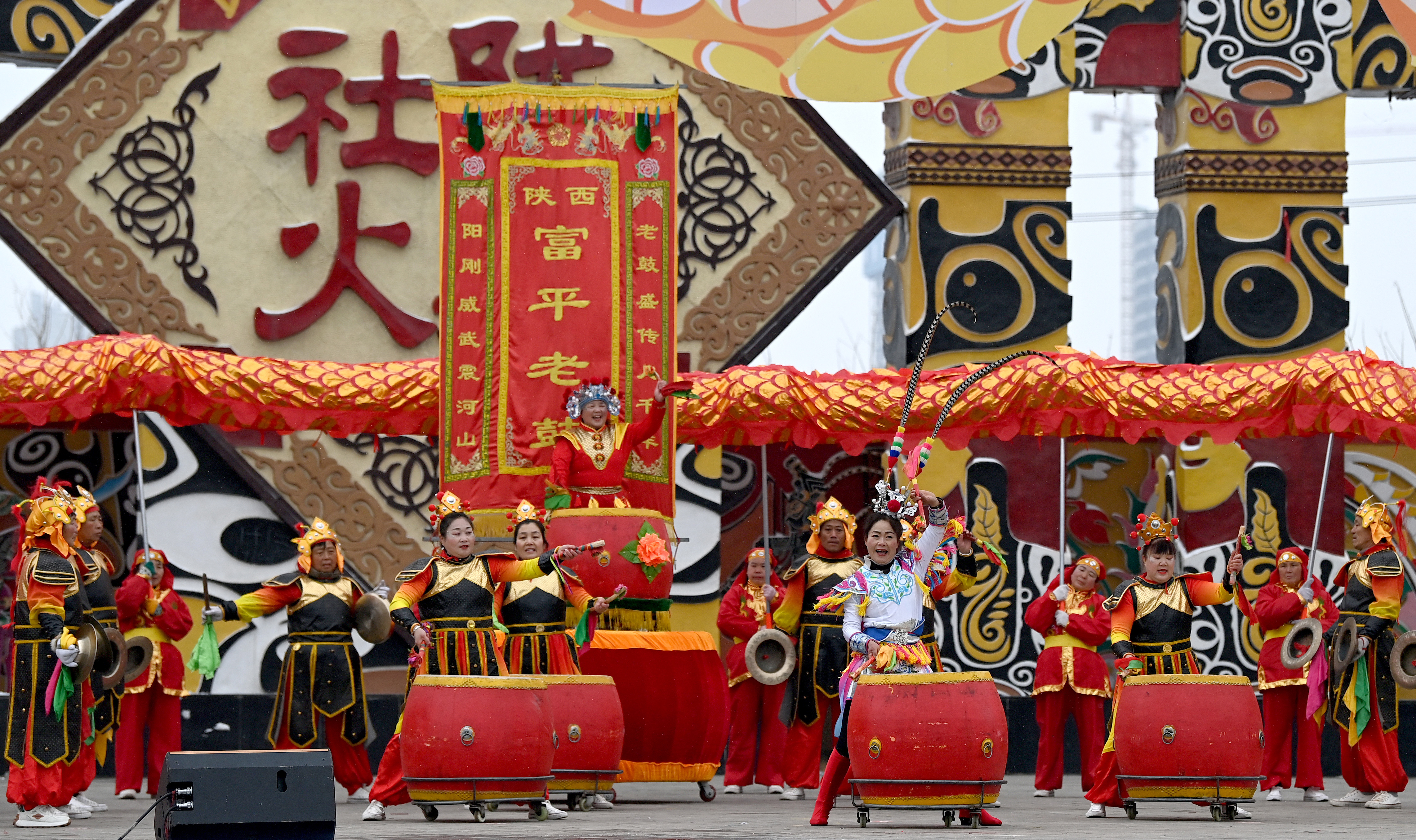 2月22日,在隴州社火過(guò)大年暨陜西省民間社火展演上,來(lái)自渭南市富平縣的社火隊(duì)在表演富平老鼓。新華社記者劉瀟攝