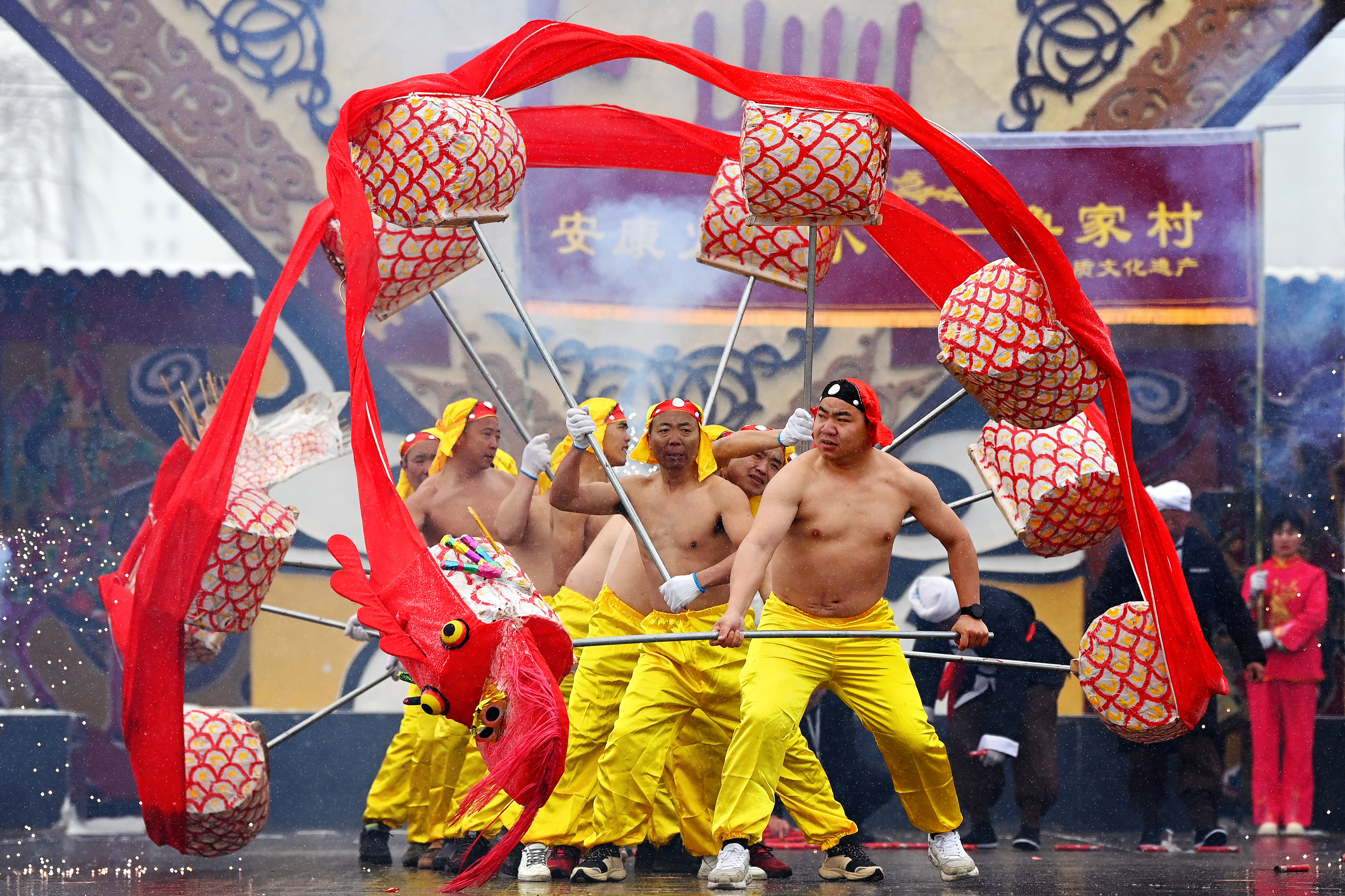 2月22日,在隴州社火過(guò)大年暨陜西省民間社火展演上,來(lái)自安康市漢濱區(qū)的社火隊(duì)在表演魯家村火龍。新華社記者劉瀟攝