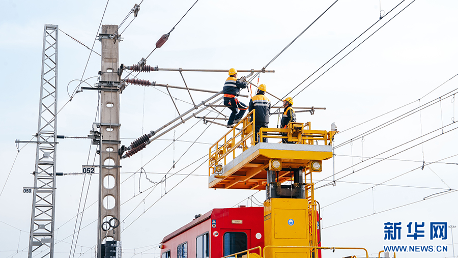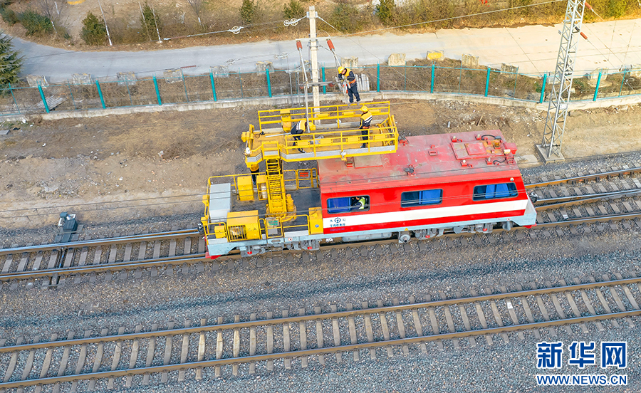 春運(yùn)期間,在隴海鐵路虢鎮(zhèn)至陽(yáng)平區(qū)段,劉建強(qiáng)和他的工友們?cè)诠╇娊佑|網(wǎng)軌道作業(yè)車上進(jìn)行檢修作業(yè)。劉一江 航拍