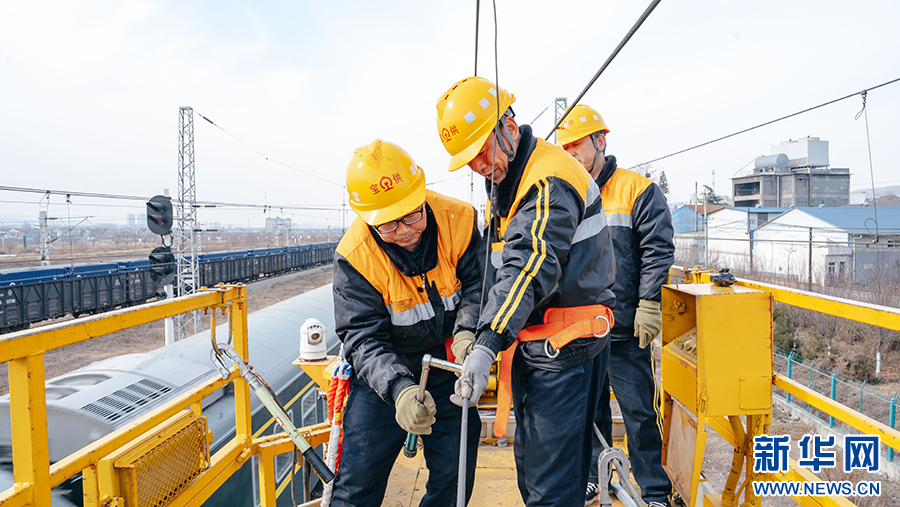 在隴海鐵路虢鎮(zhèn)至陽(yáng)平區(qū)段,劉建強(qiáng)(左)和工友們?cè)诠╇娊佑|網(wǎng)軌道作業(yè)車上緊固供電設(shè)備接觸網(wǎng)腕臂支撐。劉一江 攝
